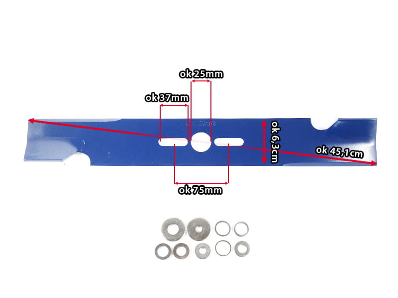 Nóż T14 uniwersalny podgięty ( 45,1cm ) do kosiarek spalinowych. Podkładki redukcyjne w zestawie.